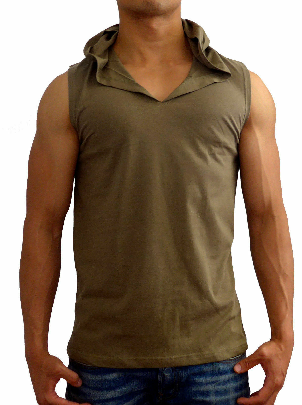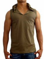 MENS HOODED SLEEVELESS TANK TOP HOOD MUSCLE BODYBUILDING GYM FATIGUE GREEN
